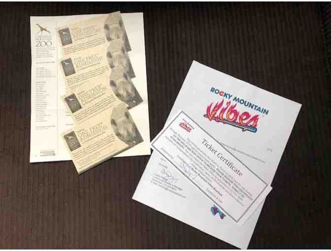 Description: This basket includes a day of fun in Colorado Springs. A family of four has tickets to both the Cheyenne Mountain Zoo and four Box tickets to the Rocky Mountain Vibes baseball game. These sets of tickets will entertain a group of four for the entire day, as you are able to do them as a set or divided amongst two days.