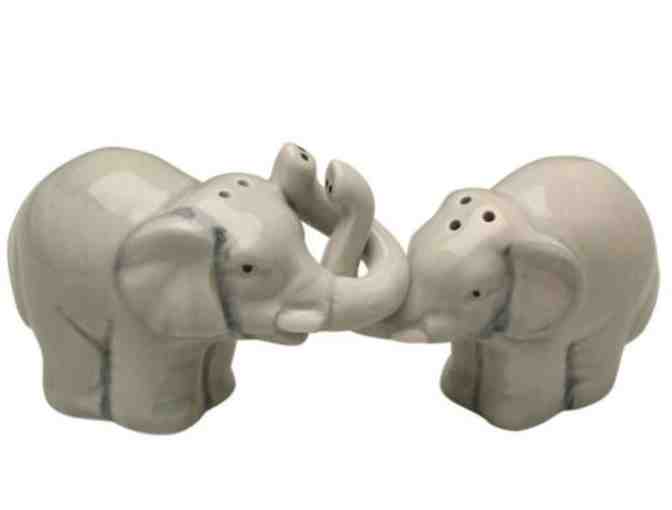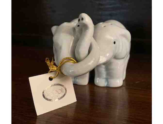 Adorable salt & pepper shakers, featuring ceramic Hugging Elephants entwining their trunks in a friendly greeting. Two piece set, gray, 3.5" long by 2.5" tall. Made by Allen Arts for the Abbott Collection.