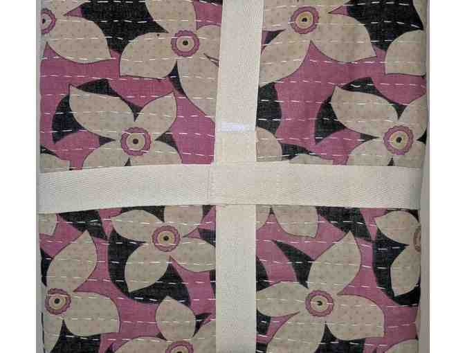 One of a kind, handmade Kantha Throw features a pleasing white-and-pink on black flower design with white overstitching. 50" x 80", 100% Cotton, Dry Clean Only. Made in India.
