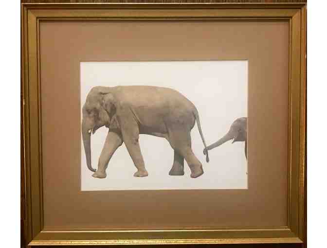 The close bond between an Asian elephant mother and her calf is clearly shown in this copyright photograph. Matted and framed under glass, 14.5" x 12".