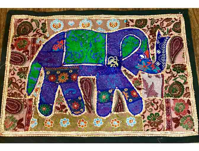 This multi-color wall hanging, depicting an Asian elephant, was hand sewn in India by the wife of a mahout. Applique with embroidery, traditional paisley and flower fabrics, on black background, 37.5" x 26".