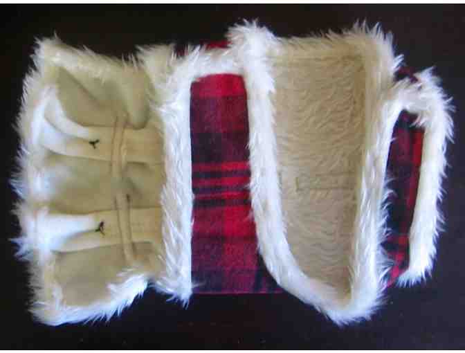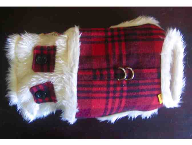 2) For winter, switch to the classic tartan coat with faux fur lining and trim, secure leash rings, and easy on-off “velcro” closures; polyester, machine washable, back length approx 13”.