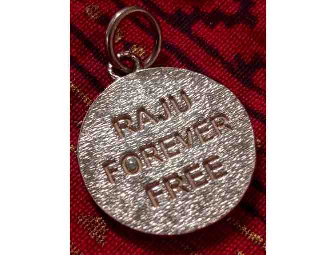 This limited edition silver pendant commemorates one of the most famous elephant rescues ever! The antique-finish pendant features Raju's likeness on the front, with “Raju Forever Free” engraved on the back. 95% silver, approx 3/4' in diameter