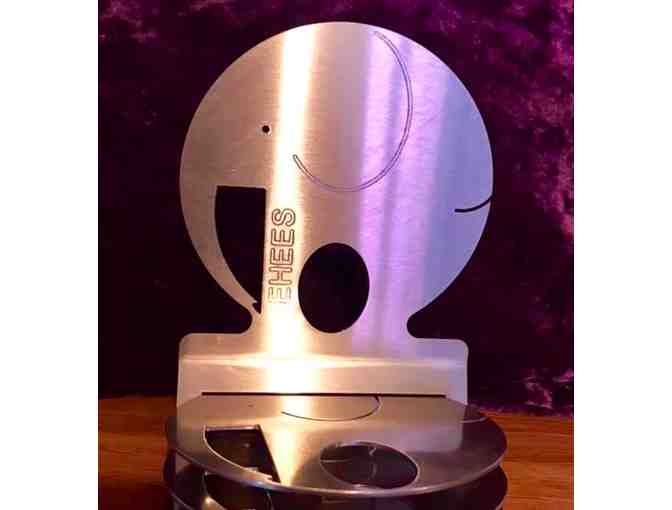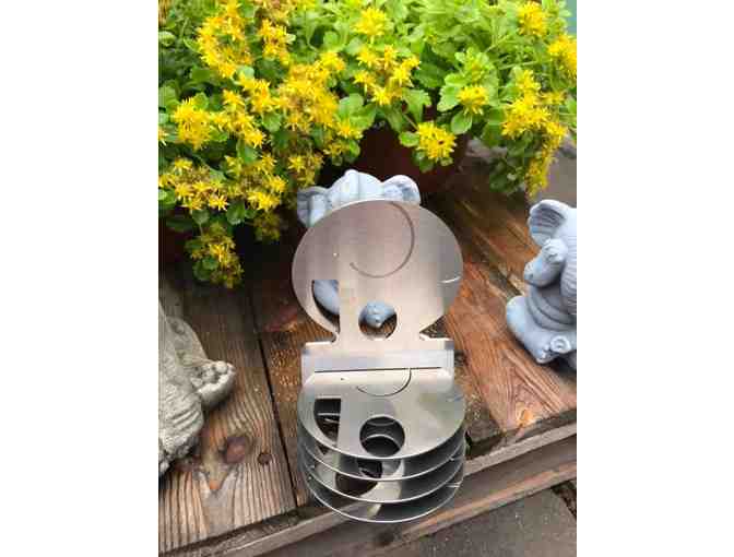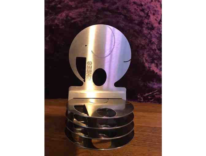 This clever set includes four elephant coasters in a non-marking, hard-wearing tumbled stainless steel elephant stand. The holder is stamped with the EHEES logo. These coasters can be used inside and out (will not rust) for cold or hot drinks, or simply just to admire as a work of modern art -- which they are!