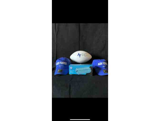 Enjoy two Air Force hats and a signed football. These items will be perfect for an Air Force fan, use this portable speaker at the next tailgate!