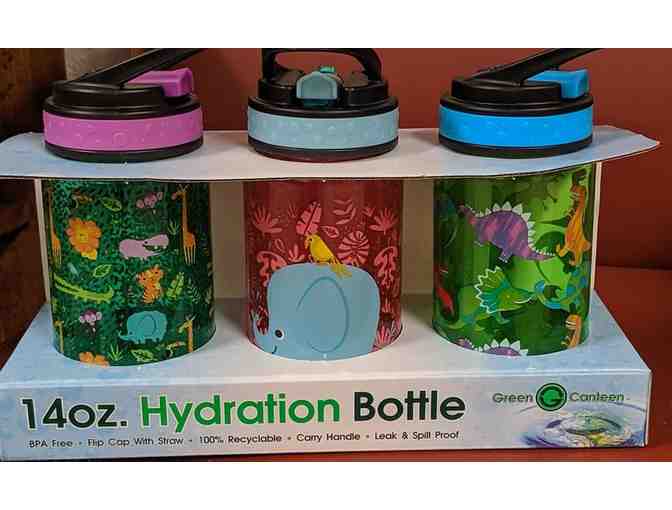 3) Three Animal Green Canteen hydration bottles - intended for cool and cold beverages. Flip cap with straw and carry handle, leak & spill proof, BPA Free, 100% recyclable.