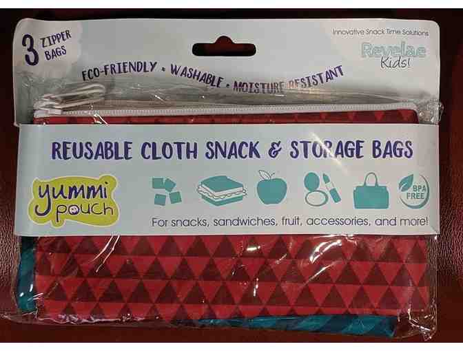 2) Three reusable, zippered snack and storage bags - For snacks, sandwiches, fruit, and more. Eco-friendly cloth bags easily fit into lunch boxes, purses and diaper bags. 4" x 7", moisture resistant interior, made from BPA-free, Phthalate-free, PVC-free and lead free polyester.
