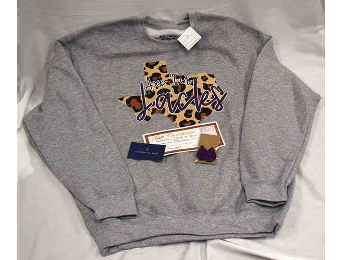 Be Game Day ready in this adorable, trendy sweatshirt! Style it up with the included set of purple glittered earrings, or pick your own accessories with your $50 gift certificate to Clothed in Armor that is also included in this amazing gift set!