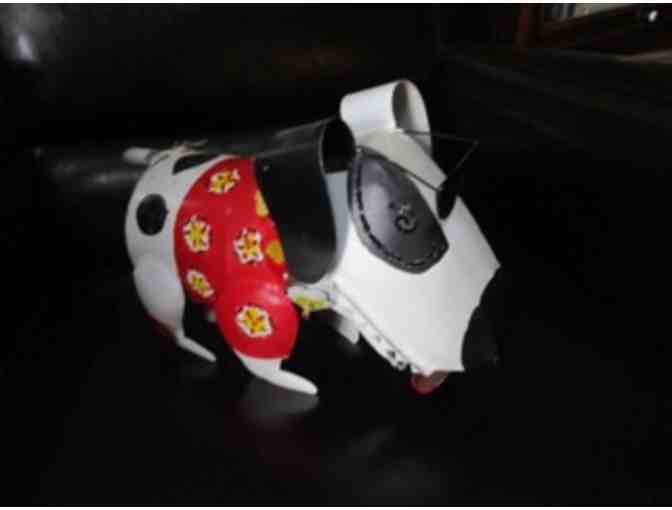 This very cute doggie has a secret hatch to put a votive candle, which shines through holes in the body. Metal body measures 8 inches tall and 11 inches long (not including the tail). Sports a classy sunglasses and a springy tail.