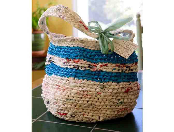 Crafter Jaynie Clark creates beautiful and functional items out of single-use plastic grocery and newspaper bags. She first turns the bags into yarn -- a process known as "plarning" -- and then crochets free-form, resulting in a unique bag or basket with added life and value.