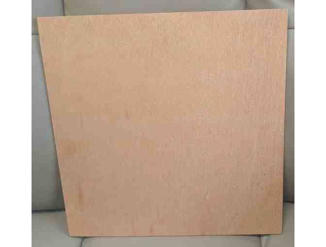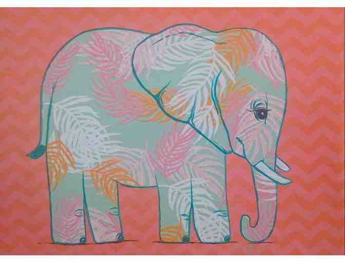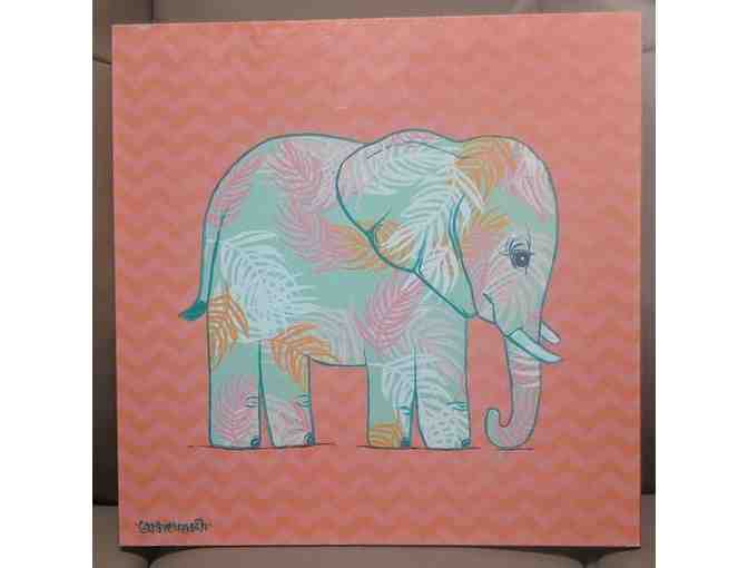This thoughtful juvenile elephant carries the jungle with him wherever he goes. Original acrylic painting on wood by artist Carrie Lensch. The calming multi-color design on a vibrant coral ground will enhance any room in the house. 12" x 12"