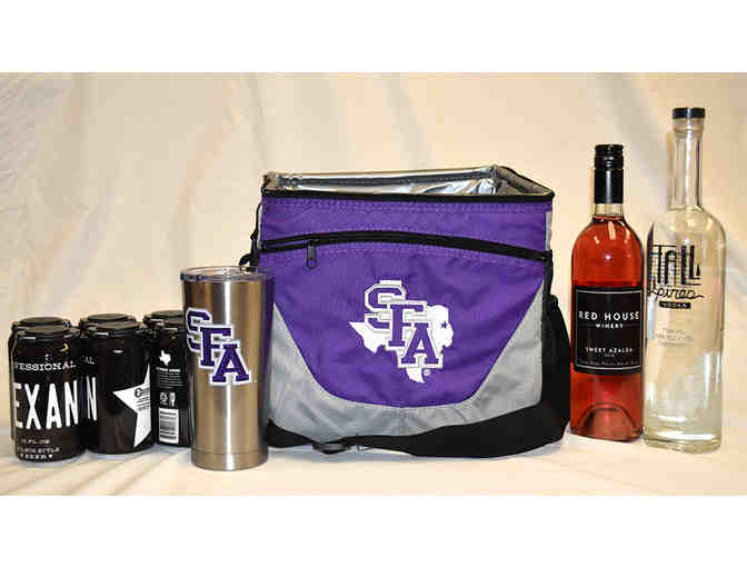 Not only do you get a stylish 'SFA' cooler if you win this item, but you also get a bottle of 'Tall Pines' vodka from Front Porch Distillery, a bottle of 'Sweet Azalea' wine from Red House Winery, a 6-pack of Fredonia Brewery's 'Texas' beer, and an SFA tumbler!