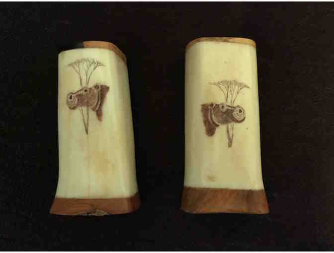 These sustainably-harvested handcarved ivory salt and pepper shakers have a Hippo carved into the design and a beautiful wood top and bottom. They are from South Africa.