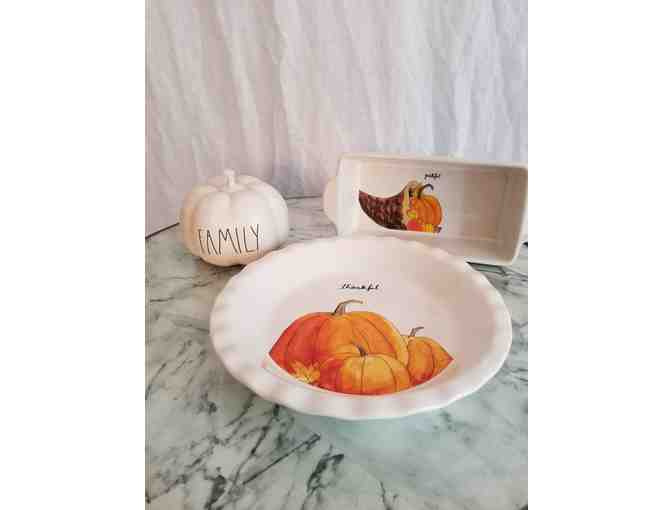 RAE DUNN HARVEST POTTERY: PIE PLATE, LOAF PAN, DECORATIVE PUMPKIN, SUGAR AND CREAM SET