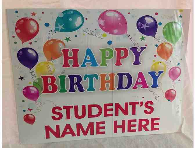 Happy Birthday Sign Week 5/4-5/8. Celebrate your special student on the week of their birthday or half birthday! Winning bidders receive an 18x24 Custom Birthday Sign with your student name on it to be displayed by the marquee for a week. Please pick up your sign on Friday afternoon.