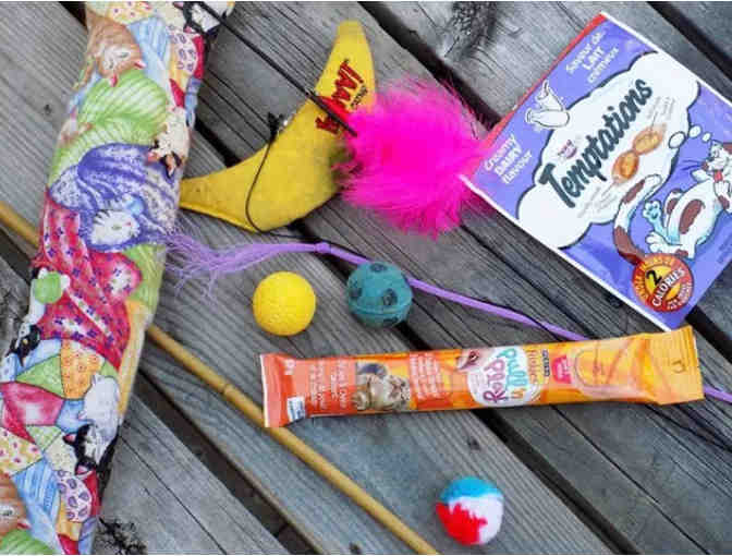 Bring home something special for your special cat. This package includes a basket filled with treats and toys for cats.