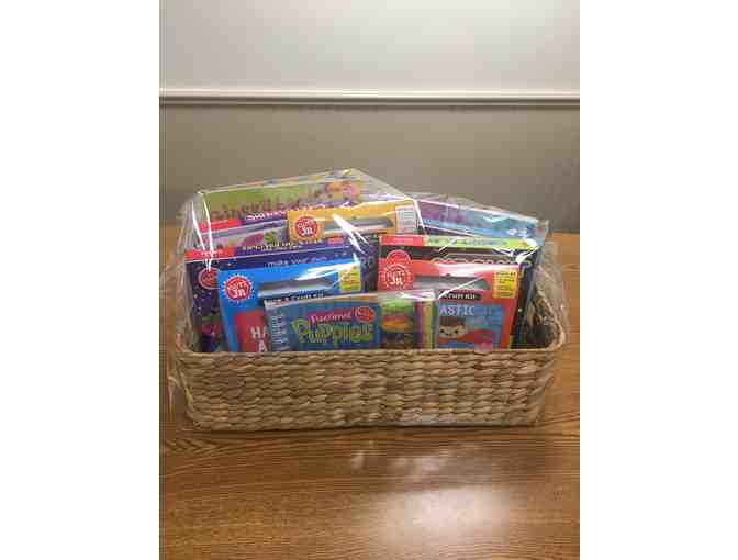This fun filled gift basket of craft kits and activity books for kids has it all.