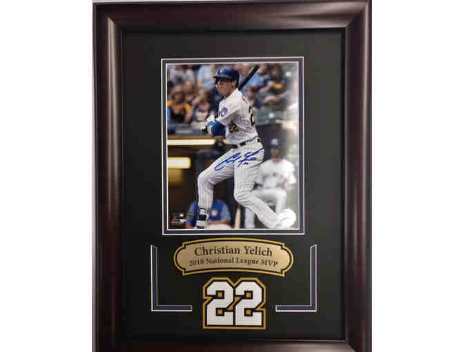 An 8x10 autographed photo of Brewers star Christian Yelich, laser cut shirt number & engraved plate, that is double matted & framed.