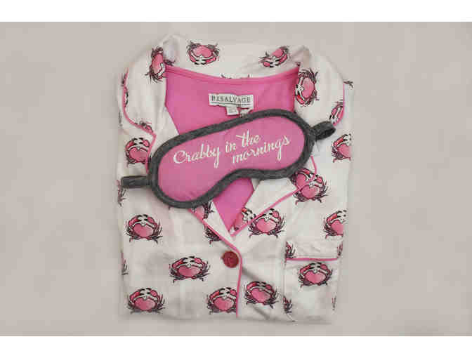 Size small pajama set with "crabby in the morning" eye mask. Top Drawer is New Hampshire's bra-fit specialist. They also stock an array of luxurious sleepwear, robes and lingerie.