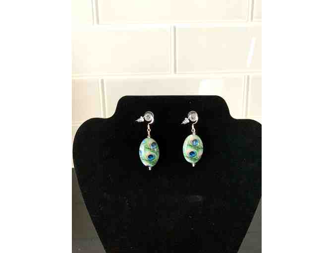 These nickle free oval peacock dangling earrings were handmade and crafted with white beads to add to the modern design