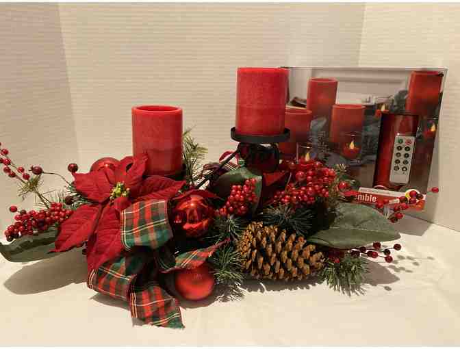 Celebrate the Holiday season with a floral centerpiece and a set of eight (8) LED candles with a remote. A lovely addition to your Holiday decor!
