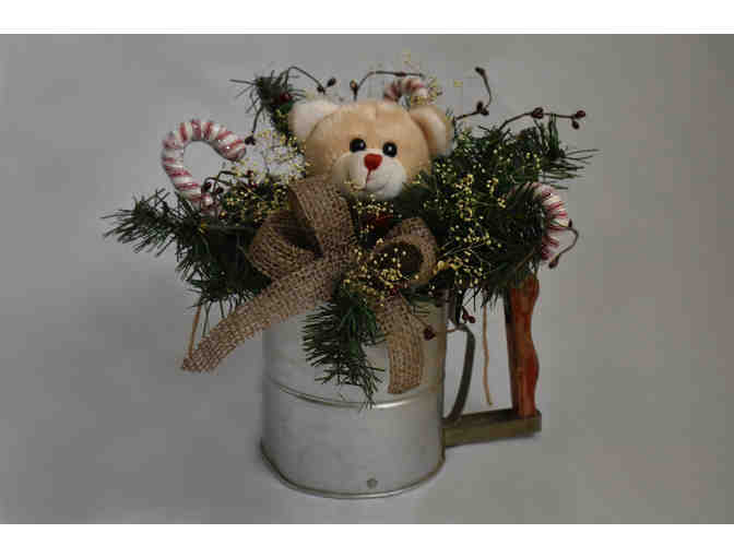 Small sifter with holiday bear surrounded by greenery and other holiday decorations.