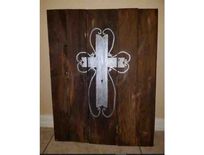 The winning bidder will receive this Silver Cross with Scrolls wooden pallet art from Tinkered Tinders.