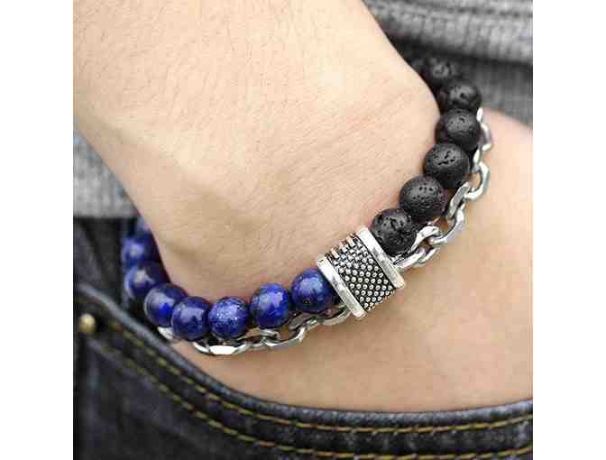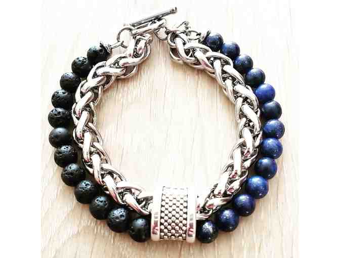 Power ~ Balance ~ Energy: This well-made bracelet is an interesting mix of natural Lapis Lazuli beads and stainless steel chain. The two strands are connected by a central steel band incised with a geometric pattern, and secured with a toggle clasp.
