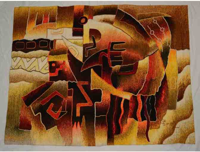 This 56" x 46" large hand-woven wall hanging tapestry signed by well-known artist, Constantino Laura, who is a master tapestry artist from Peru, taught by his famous father Miguel Laura, who only sells his work in top galleries:purchased at one of the top art galleries in Cusco, Peru.
