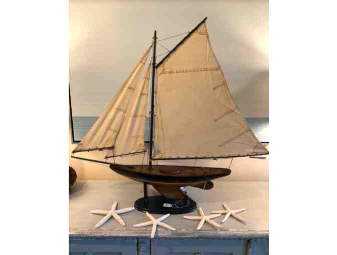 Newport Sloop is all wood and walnut finished, brass antiqued hardware, tea stained sails, complete with stand and cast-iron original keel weight. This will make a statement in your home.