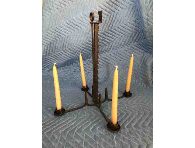 Hand forged iron chandelier created by Paul Spaulding. Mr. Spaulding is a Master Blacksmith and well respected in this field. He worked at The Farmers Museum in Cooperstown, NY for a number of years This chandelier accommodates 4 candles and 4 burning reeds. The height of the center post is 1 foot 4" and extended 2 feet 2 1/2 " high.