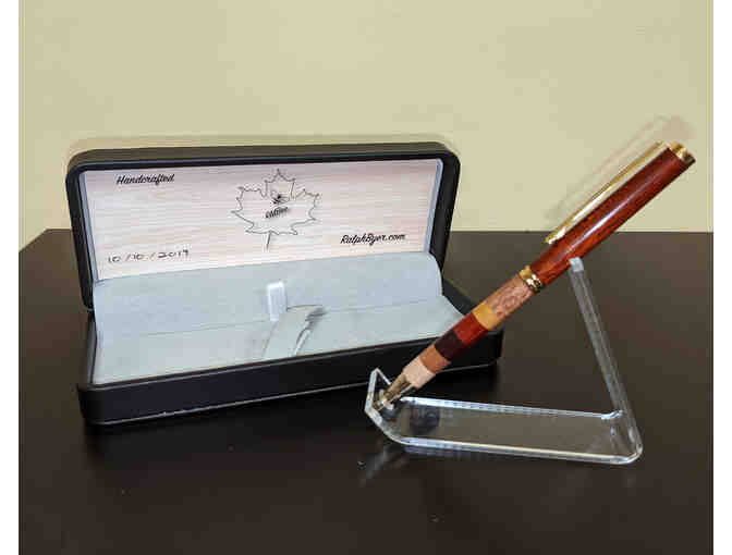 Each pen is turned from repurposed exotic or native raw woods, is meticulously turned, and finished. The pen case displays Ralph Byer's one of a kind logo - a bee resting up on a maple leaf.