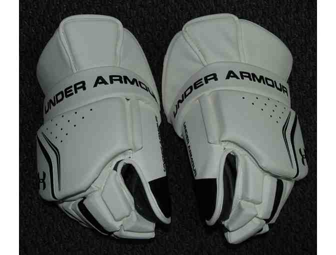 The bearer of this item will receieve one pair of white Under Armour Box Lacrosse Goalie Gloves size large.