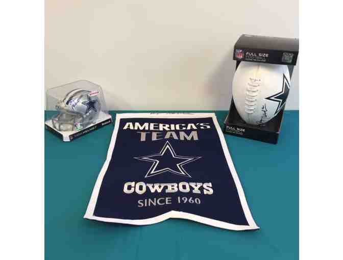 Cowboys fans, this one's for you! Add this Roger Staubach autographed full-sized football, mini-helmet and banner to your collection.