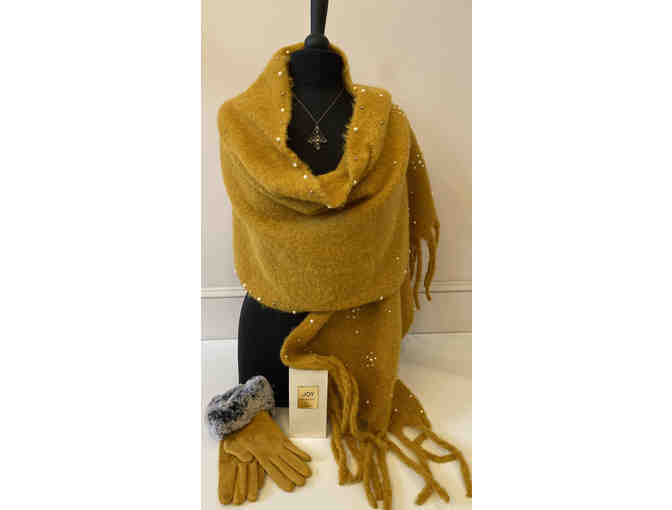 Bid for a Miss Sparrow London scarf with pearls and silver beads, a pair of matching mustard Echo gloves with faux fur & touch fingers. You won't have to take your gloves off to use your phone, no freezing fingers. An Anne Koplik necklace with Swarvorski crystals and a 1.5 oz bottle of Joy Eau de Toilette complete your package. Not only will you look fabulous, you will smell lovely as well!