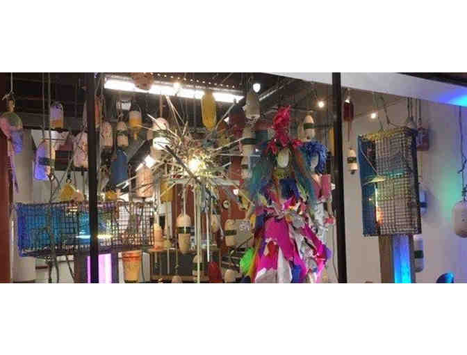 Feather your own nest with this one-of-a-kind chandelier crafted by award-winning artist Machine Dazzle. Created on the heels of Machine’s recent Guggenheim commission, especially for Ovations, this eco-art original finds its inspiration in Maine’s love of the sea. Assembled from sail battens, "Next" is perfect for a home or business looking to make an artful, Maine-made statement. Artist Machine Dazzle, who is known to say “glitter rhymes with litter,” is best known for his wholly original costumes and stage concepts for MacArthur Genius and Pulitzer Prize finalist Taylor Mac … when he’s not contributing to looks for super model Cara Delevingne and fashion icon Diane von Furstenberg’s recent appearances at the celebrated Met Gala. Comes with statement of authenticity.