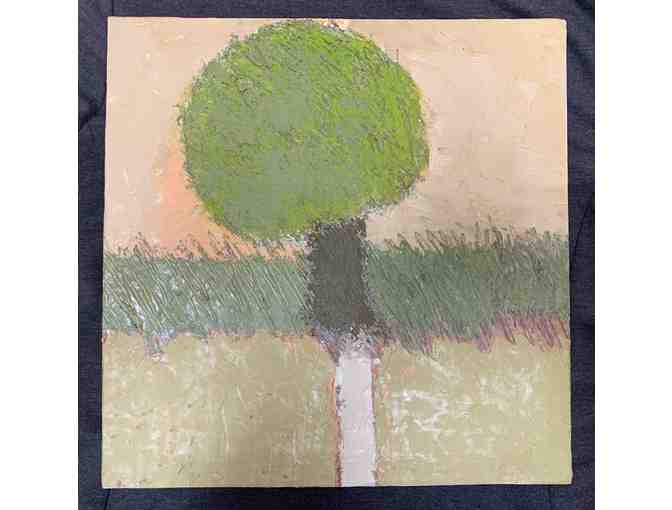 The painting, "Green Tree", measures 13.5" x 13.5" and is oil on paper on panel. It was created by Tim in 2017.