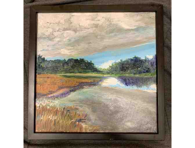 You can almost smell the salt air when you look at this one! Local landscape artist, Lyn Rosoff, created this beautiful oil painting in 2019. It has a simple black wooden frame measuring 13" x 13".