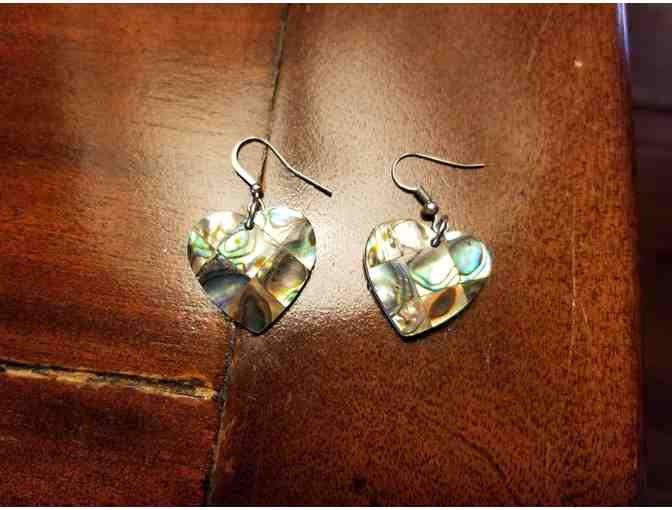 Beautiful and unique abalone shell pierced earrings. Heart shaped. Approximately 1 inch long