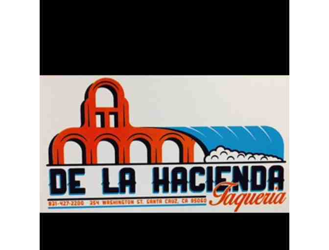$25 gift certificate to De La Hacienda,a family-owned Mexican restaurant renowned for their fresh ingredients & homemade burritos, tacos, quesadillas, tortas, and chimichanga. Enjoy beer & wine and delicious Mexican food in a family-friendly space. Open daily in Santa Cruz.