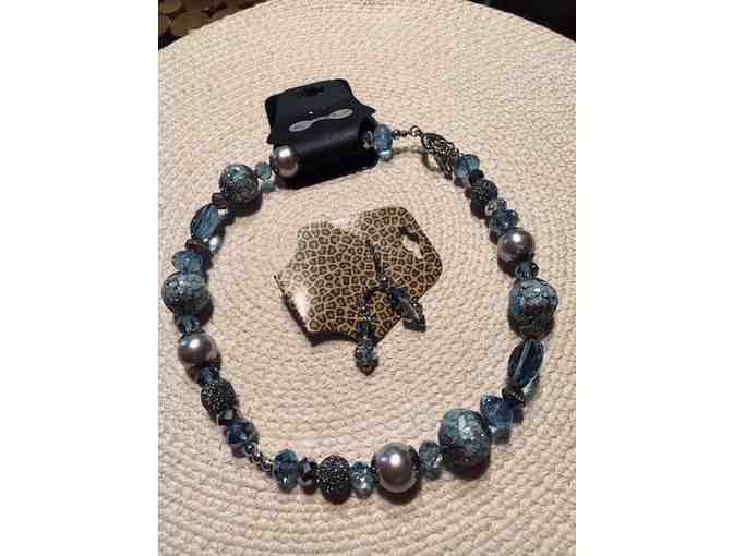This beautiful sea blue necklace and matching drop earrings made crystal beads with silver accents will keep you thinking ocean breezes all year long!