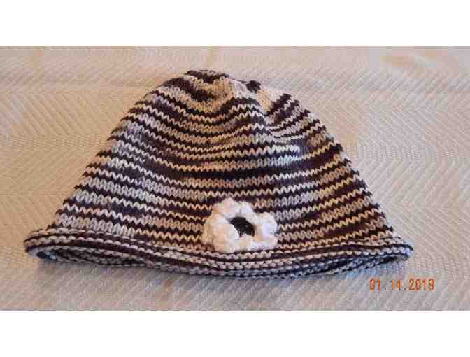 This item consists of a black and white winter knit hat made locally by Kitty Pelky. This item benefits the Central Aroostook Historical Society.