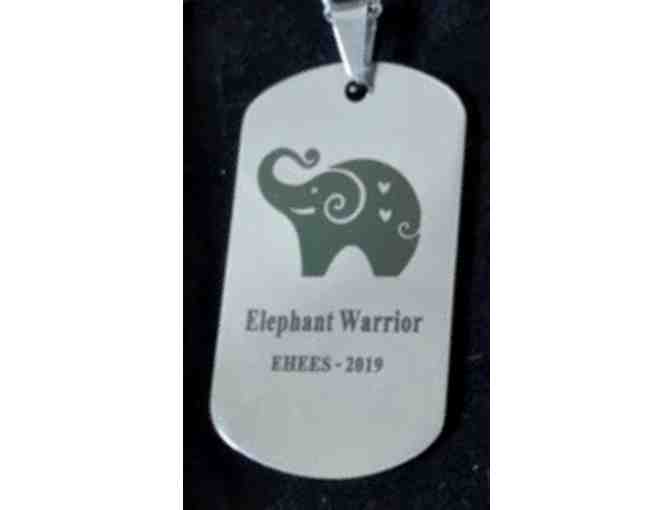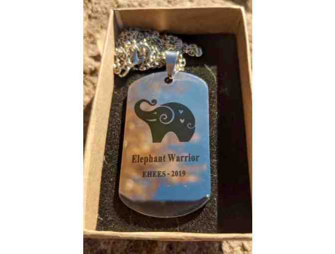 1) Elephant Warrior "dog tag" style necklace, engraved with "EHEES - 2019" beneath a lucky trunks-up elephant. Perfect for men or women, the stainless steel pendant is 1" x 2", with a 24" silver plated chain.