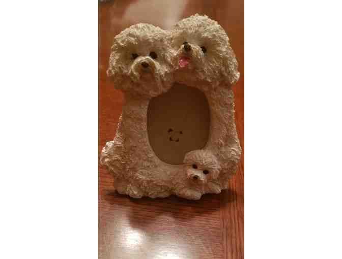 Adorable Bichon picture frame. Approximately 3x4 inches. Has stand and magnets on back.
