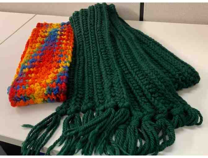 Enjoy two scarves created by your talented coworker! Perfect for a chilly Minnesota winter, these two scarves can be worn as casual pieces in an outfit, or as beautiful outerwear.