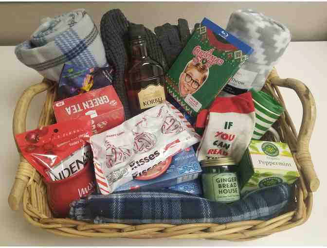 • 2 scarves • 2 fleece throws • Knit cap • Knit gloves • 2 pairs of novelty holiday socks • Package of cough drops • Christmas coffee cup • Holiday ceramic travel mug • 2 Packs of Hershey’s Hugs and Kisses • 2 boxes Hot chocolate mix • ‘A Christmas Story’ on Blu Ray • Fire starting kit • Box of green tea • Box of peppermint tea • Scented holiday candle • Bottle of Korbel Brandy