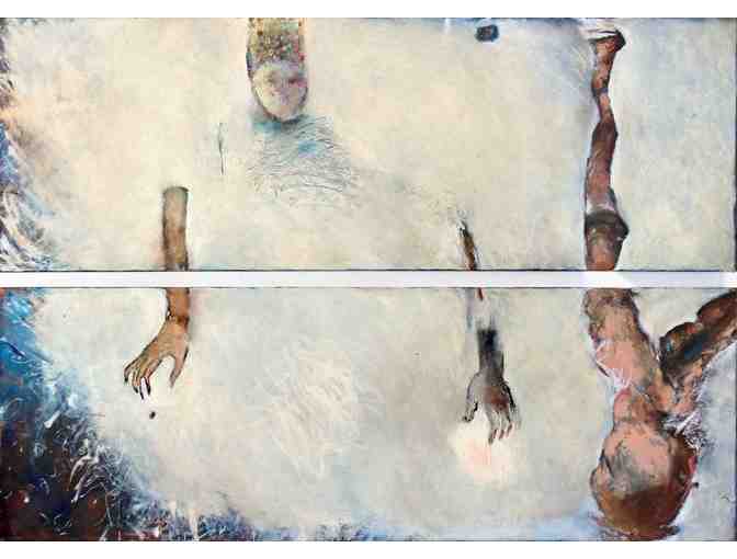 This diptych titled, "Angel of Blues" measures a total size of 40" x 60". It is an oil on canvas (2 canvases each 20" x 60"). What Robin said about her art is: "Sometimes drawing is imbued with the ancientness of heavy stones, of light that floats, of paint melting my hands into a new surface......"