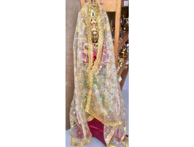 This lovely shiney gold chuni has been worn by the Divine Mother in the Crestone Temple. It measures about 74 x 40 inches. This stunning piece wiill make a beautiful and special addition to any altar or murti.