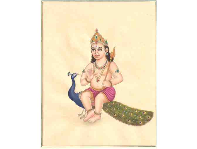 Kartikeya is the son of Shiva and Parvati, the brother of Ganesha. Original paper painting. Approximate size is 5"X7".