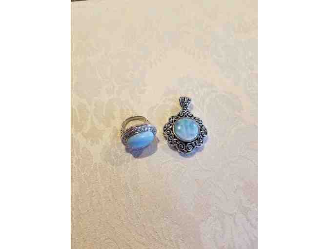 Pendent and ring. Sterling silver and unusual light blue Turquoise stones. Lovely filigree continues from sides to cover the back of the pendant. Ring size 6.